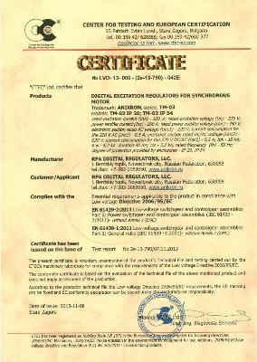 According to the technical files, 4 models of the digital excitation regulators for synchronous motors: ANIKRON TM-03 IP 20, ANIKRON TM-03 IP 54, ANIKRON TM-03 B IP 20 and ANIKRON TM-03 B IP 54 have proven compliance to IEC/EN 61439-1:2011, IEC/EN 61439-2:2011 standarts, meet the requirements of the Low voltage Derective 2006/95/EC and after all the necessary examination and testing bear the CE Marking.