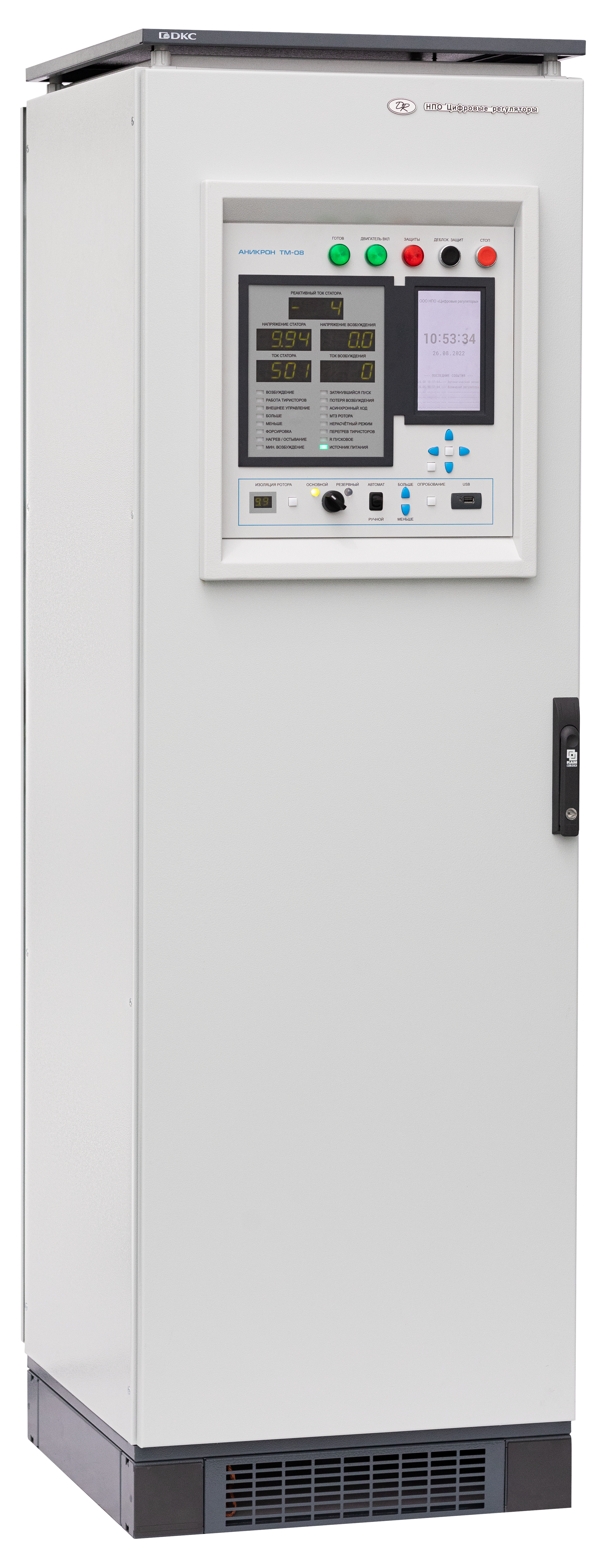 The ANIKRON TM-08 digital excitation regulator for synchronous motors is designed to supply the rotor field winding and automatically control the excitation current during direct-on-line, reactor, variable-frequency, and soft starts, as well as during synchronous operation and emergency conditions of industrial synchronous motors (up to 32 MW) equipped with brush excitation systems.