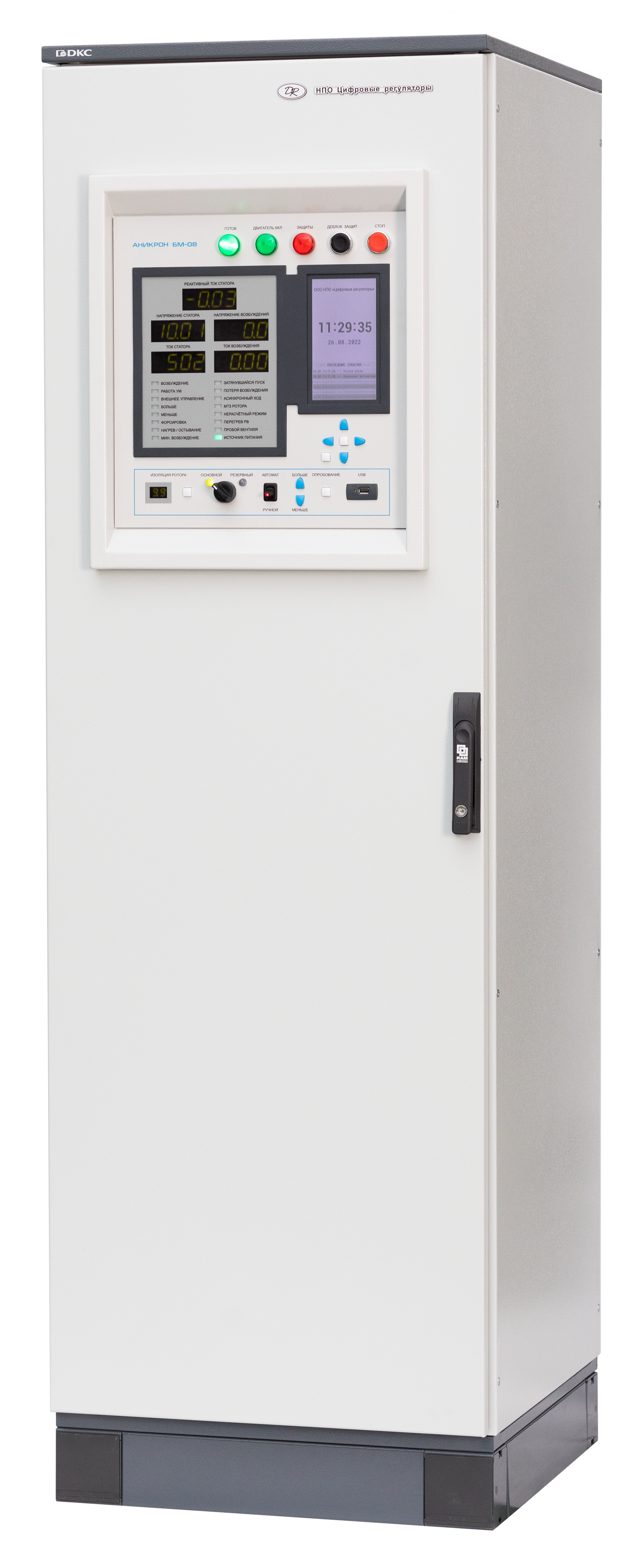 The ANIKRON BM-08 digital excitation regulator is designed to supply the field winding and automatically control the excitation current of industrial synchronous motors (up to 32 MW) equipped with brushless excitation systems during startup, synchronous operation, and emergency conditions.
